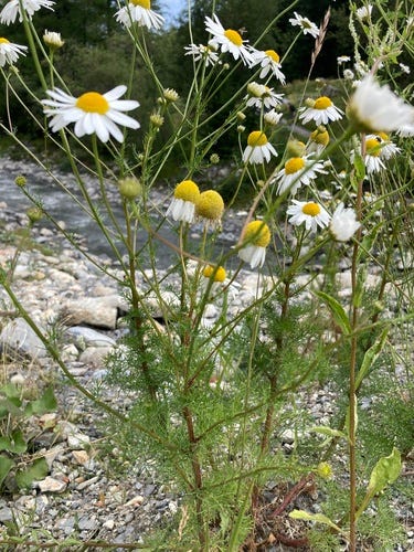 We head over to the other side of the valley and take a bridge over that stream of fast-running glacial melt. On the bank I see a familiar friend from my garden: German chamomile (Matricaria chamomilla). Plucking a head and crushing it, I confirm that characteristic fragrance of chamomile tea.