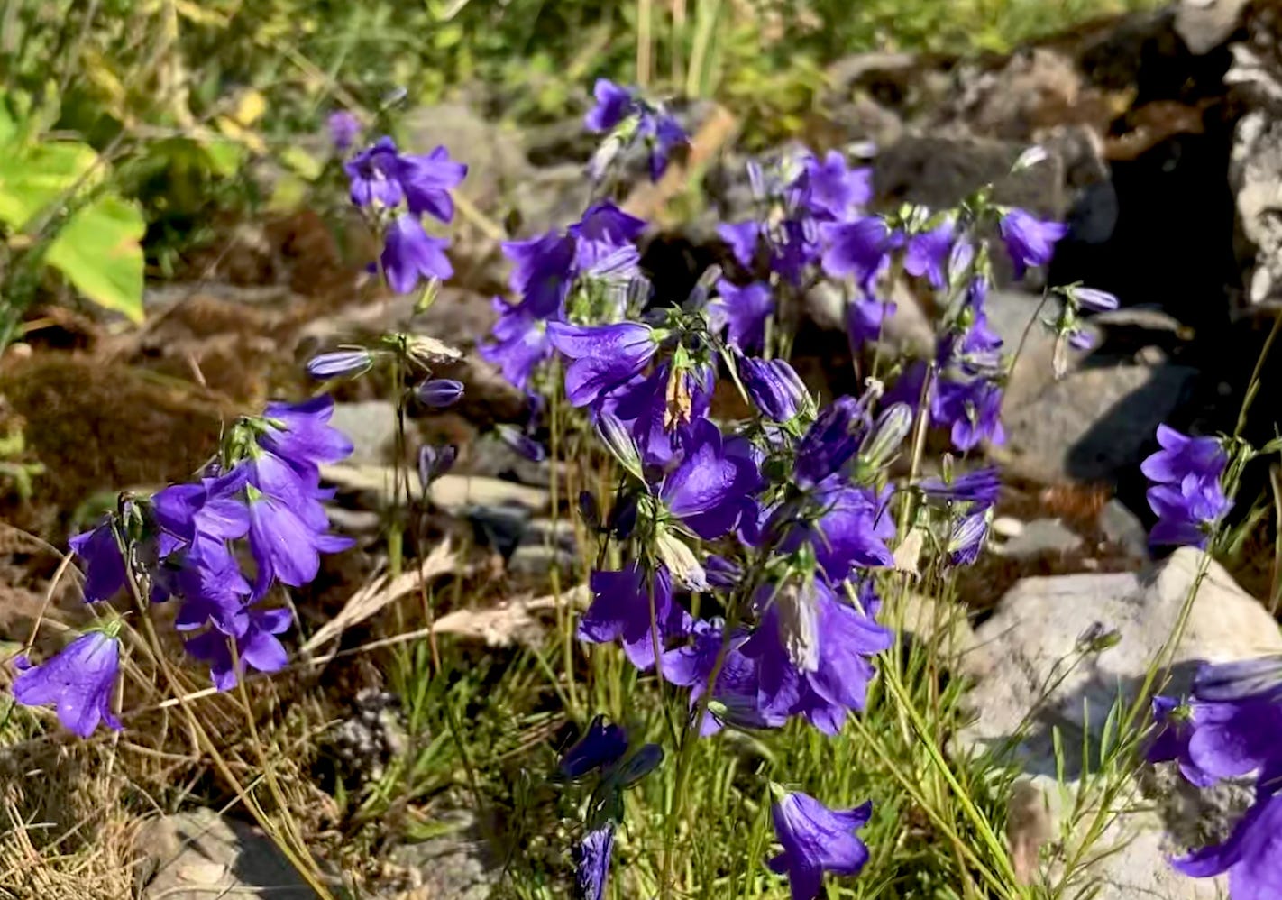 First some flashes of purple catch my eye. Delicate harebells are in bloom at all rock walls, road edges, and mossy patches. They closely resemble the harebell we have in the northeast (Campanula rotundifolia). The Latin name makes perfect sense: Campanula means ‘little bell’, while rotundifolia means ‘round’, referring to the small, round basal leaves no larger than a finger nail.