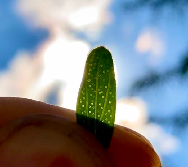 There are however several species of Hypericum, so I hold one leaf to the sun. Sure enough, it has many small perforations that confirm it is Hypericum perforatum, the species most prevalent in the USA.