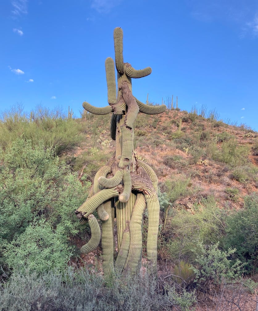Finally, we descended the rim down towards Phoenix. As we rapidly dropped elevation, the pines vanished and only several switchbacks later appeared the Arizona state tree. We knew our destination was near.